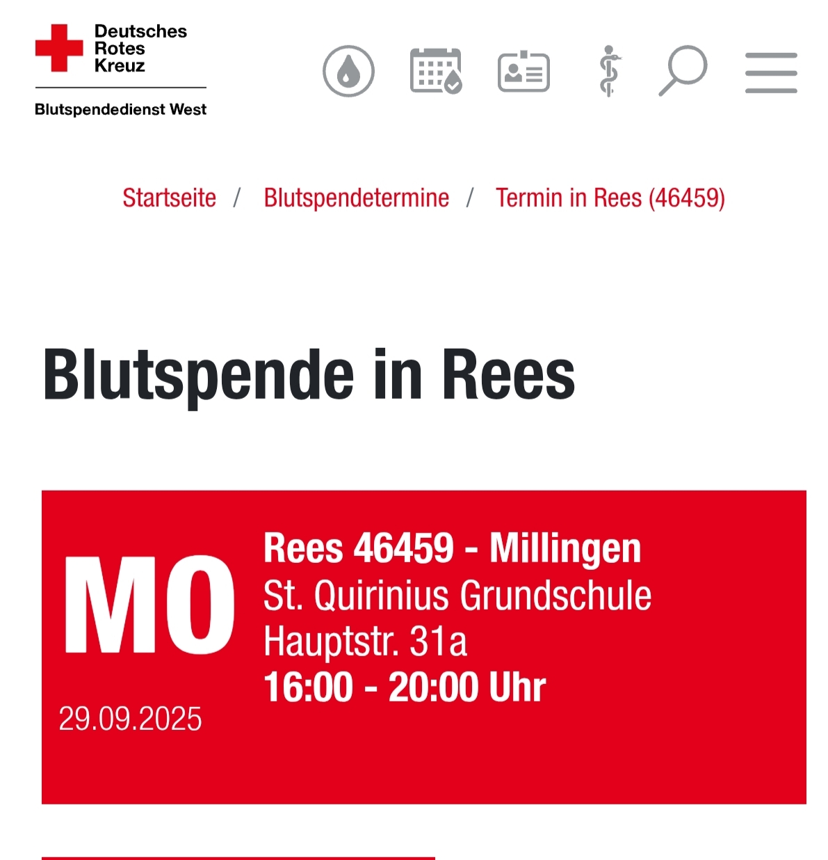 Allgemein Blutspenden Heute Maik Holtermann29. September 2025 Kommt vorbei! Das DRK braucht dringend Blut. Bis 20.00 Uhr habt ihr noch die Möglichkeit euer Rotes Gold zu spenden. DRK-Blutspendedienst West @blutspende.jetzt #blutspenden #drk #millingen #grundschule