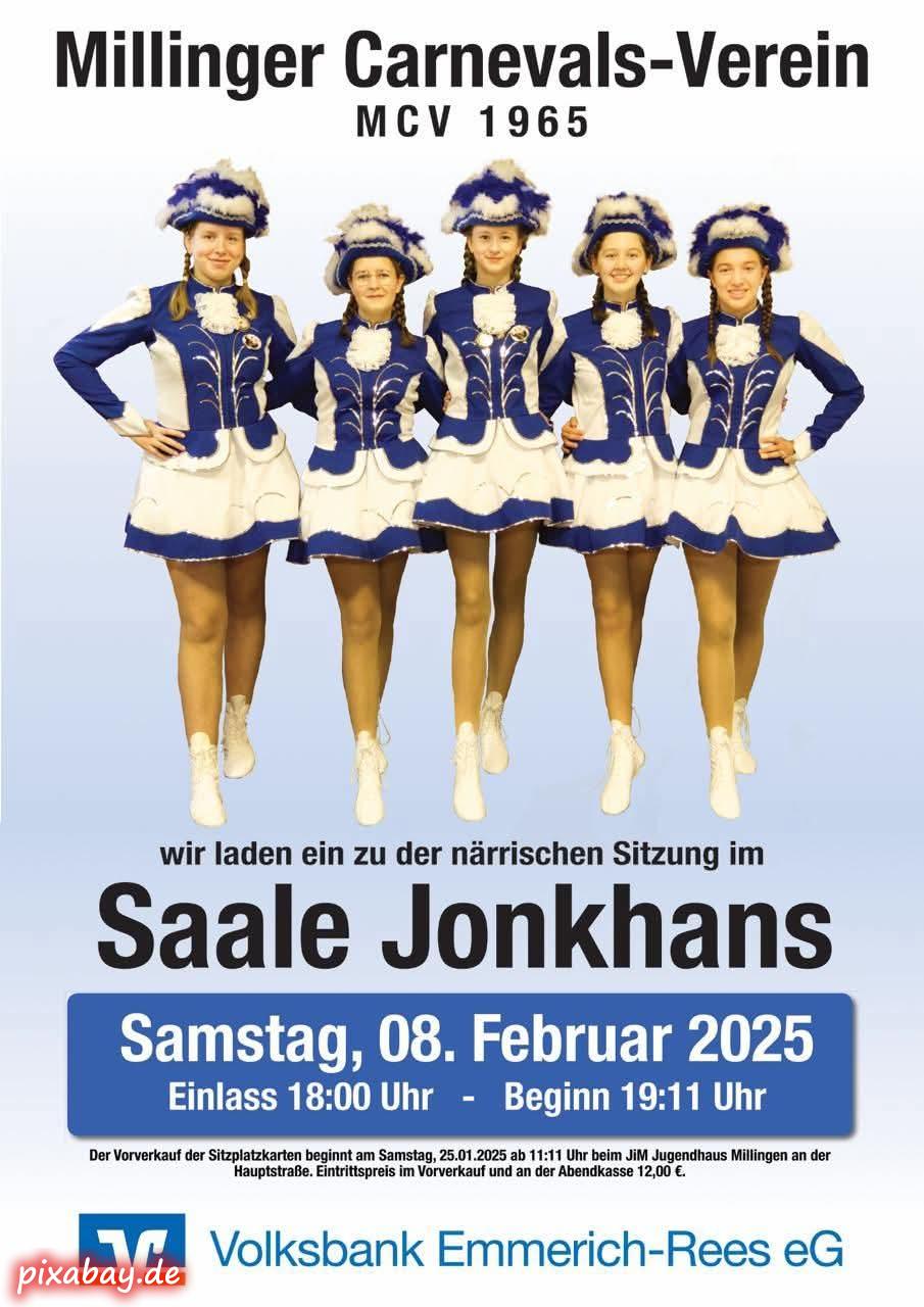 Der Kartenvorverkauf findet am Samstag, dem 25.01.2025 im Zeitraum von 11:11 Uhrbis 13.00 Uhr am „JiM – Jugendzentrum Millingen“, Hauptstraße 15 A statt. Wie in den Jahren zuvor werden die Eintrittskarten in der Reihenfolge des Eintreffens der Zuschauer*innen verkauft.